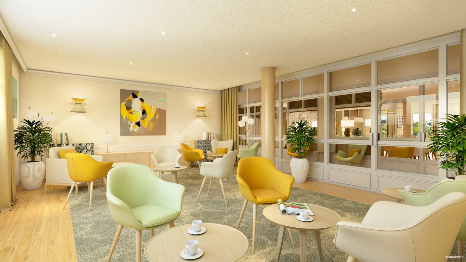 Les grands atouts de cette résidence moderne se trouvent dans les espaces communs chaleureux. Notre salon possède une cheminée et un jardin d’hiver.