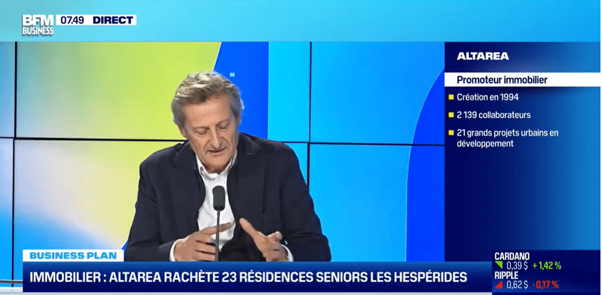 Ce vendredi 24 novembre, Jacques Ehrmann, directeur général d'Altarea, a abordé la nouvelle diversification chez Altarea avec le rachat de 23 résidences seniors les Hespérides et le changement de marque de Cogedim Club, dans l'émission Good Morning Business, présentée par Pauline Ducampet Christophe Jakubyszyn.
